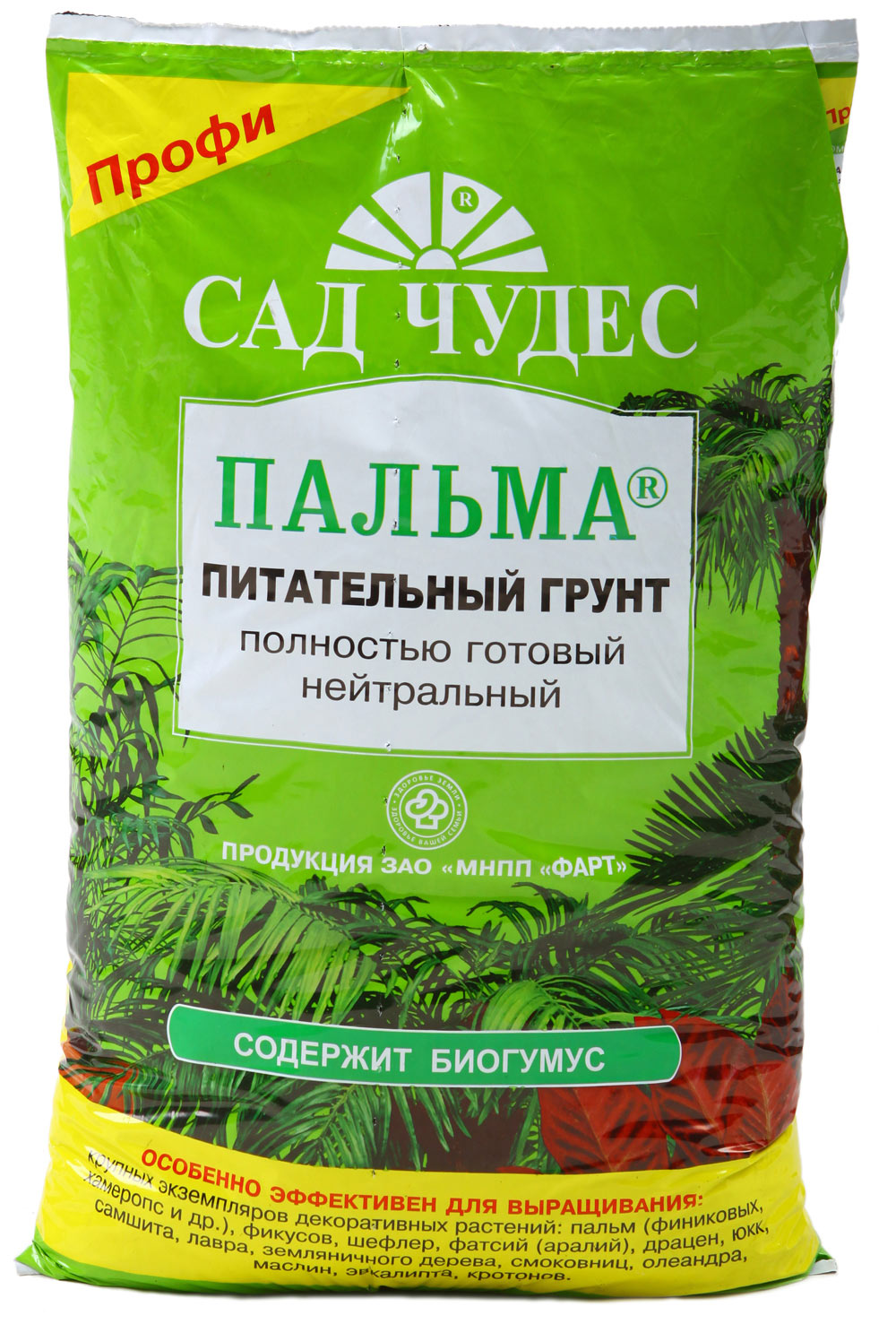 Почвогрунт полностью готовый нейтральный, средней плотности за счет повышенного содержания песка, высокообеспеченный элементами питания, содержит агроперлит. Особенно эффективен для выращивания: пальм (финиковых, хамеропс и др.), фикусов, шефлер, фатсий (аралий), драцен, самшита, лавра, земляничного дерева, смоковниц, олеандра, маслин, эвкалипта, юкк, кротонов.