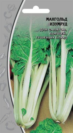 МАНГОЛЬД ИЗУМРУД Для салатов, борщей, тушеных блюд Холодостойкий среднеспелый (90–100 дней) сорт. Листья крупные, сильногофрированные, темно-зеленые, очень нежные и вкусные. Черешки светло-зеленые, длиной 20–25 см. Урожайность до 7 кг/кв. м. Ценность сорта: высокая урожайность, устойчивость к цветушности, повышенное содержание витаминов, каротина, минеральных солей, белка, сахаров. Используют в свежем виде как салатную зелень, для приготовления голубцов, черешки маринуют, тушат, делают икру, отжимают сок.
